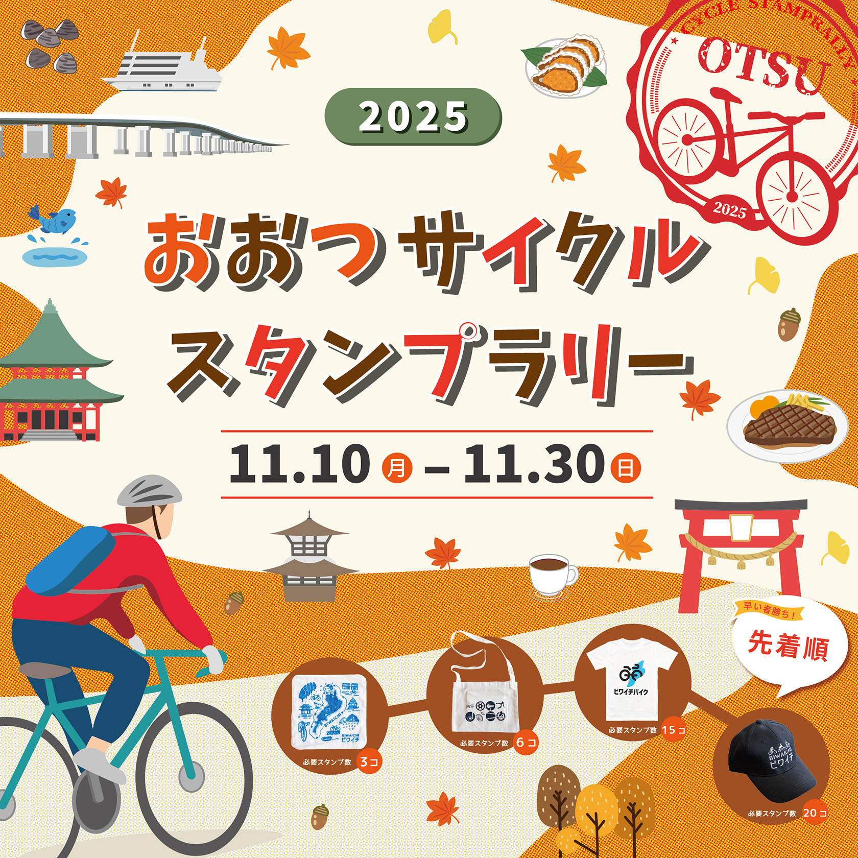 11/10(月)から11/30(日)の期間中、大津市内で「おおつサイクルスタンプラリー」を開催します。